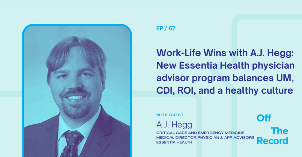 Listen to the episode here. Until about 6-7 years ago A.J. Hegg had little idea what the acronyms CDI or UM were, much less what they did or how they helped hospitals. Today the Essentia Health hospitalist is leading a new physician advisor program and making a big impact on his organization. Both from…